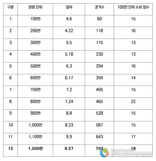 올 시즌 KBO 리그는 100만명 단위 관중 달성을 모두 역대 최소 경기로 달성한 바 있다. 또한, 지난 8월 23일 2시즌 연속 1,000만 관중 달성, 9월 5일 역대 한 시즌 최다 관중 신기록 달성, 9월 9일 역대 최초1,100만 관중 달성에 이어 1,200만 관중을 달성하며 또 한번 새로운 기록을 작성하게 됐다.