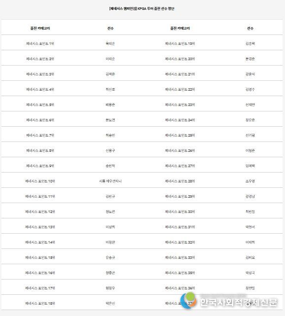 제네시스 포인트 1위 옥태훈(27.금강주택)을 비롯해 2위 이태훈(35.캐나다), 3위 김백준(24.속초아이), 4위 최진호(41.COWELL), 5위 배용준(25.CJ), 6위 문도엽(34.DB손해보험), 7위 최승빈(24.CJ), 8위 신용구(34.금강주택), 9위 송민혁(21.CJ), 10위 사돔 깨우깐자나(27.태국)까지 제네시스 포인트 TOP10 선수들과 36위 정한밀(34.경희), 37위 김동민(27.NH농협은행)까지 제네시스 포인트 상위 36명이 참가자 명단에 이름을 올렸다.