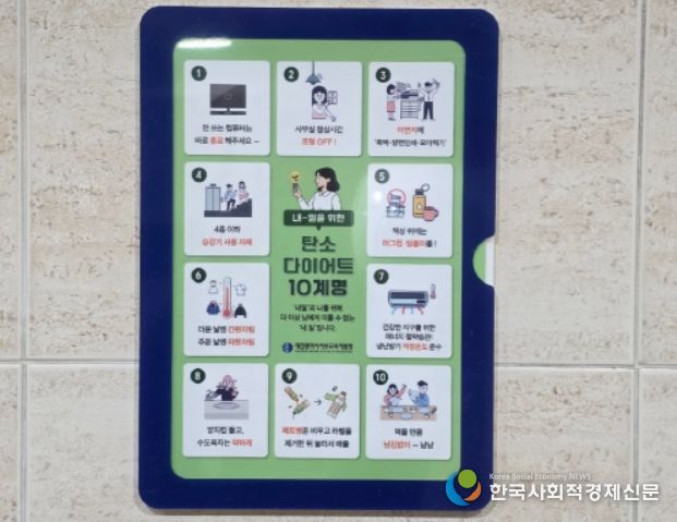한국사회적경제신문 기자 | 대전서부교육지원청은 공공기관의 적극적인 에너지 절약 문화를 정착시키고, 민원인과 직원들이 함께 보고 참여할 수 있도록 지원청 내 화장실에 ‘내-일을 위한 탄소 다이어트 10계명’ 홍보물을 제작하여 부착했다고 밝혔다.