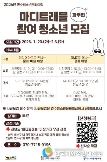 한국사회적경제신문 기자 | 연수청소년문화의집은 겨울방학을 맞아 청소년들의 알찬 방학 생활과 문화·예술적 소양 함양을 돕기 위해 ‘겨울방학 프로그램’을 운영한다.