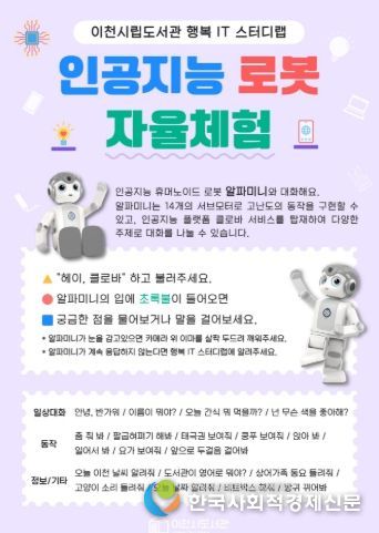 한국사회적경제신문 기자 | 이천시 시립도서관은 시민들이 인공지능 기술을 일상 속에서 자연스럽게 체험할 수 있도록 인공지능 로봇 자율체험을 2월부터 10월 중순까지 운영한다고 밝혔다.