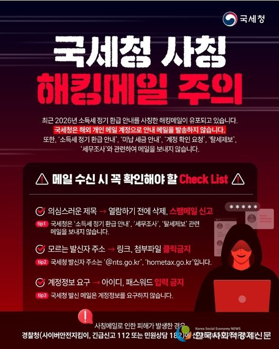 최근 2026년 소득세 정기 환급 안내를 사칭한 해킹메일이 유포되고 있습니다. 국세청은 해외 개인 메일 계정으로 안내 메일을 발송하지 않습니다. 또한, '소득세 정기 환급 안내', '미납 세금 안내', '계정 확인 요청', '탈세제보', '세무조사'와 관련하여 메일을 보내지 않습니다.