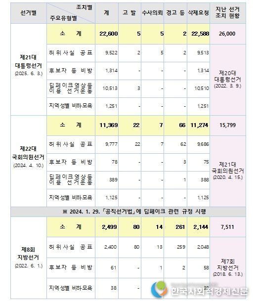 중앙선관위는 딥페이크 제작물이나 허위사실공표·비방 행위는 후보자에게 회복하기 어려운 피해를 줄 수 있고 유권자의 판단을 왜곡하여 선거결과에 영향을 미칠 수 있다면서, 깨끗한 사이버선거문화 조성을 위해 관계기관 등의 적극적인 협조를 요청했다.