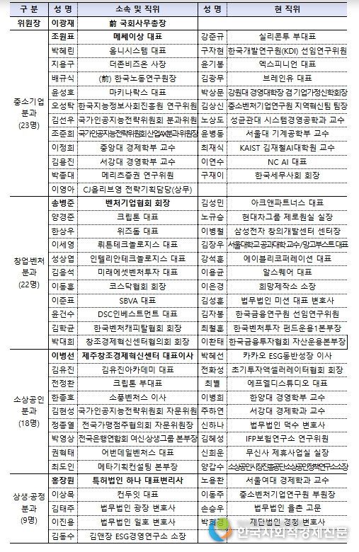 민관 정책협의회는 기업인, 민간 전문가, 학계, VC, 협·단체 등 총 72명의 위원으로 구성되어 출범일로부터 1년간 활동하게 된다. 또한 한성숙 중기부 장관과 이광재 전 국회사무총장이 공동위원장을 맡아 민관 정책협의회를 이끌어갈 예정이다.