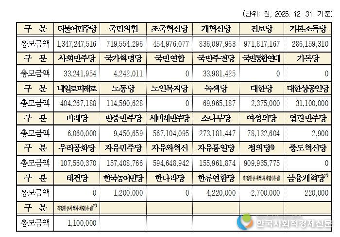 한국사회적경제신문 claire-shin 기자 | 중앙선거관리위원회는 2025년도 중앙당후원회와 국회의원후원회의 후원금 모금내역을 집계한 결과, 37개의 중앙당(중앙당창당준비위원회 포함)후원회가 총 81억 7천8백여만 원을, 303개의 국회의원후원회가 총 608억 3천2백여만 원을 모금했다고 밝혔다.
