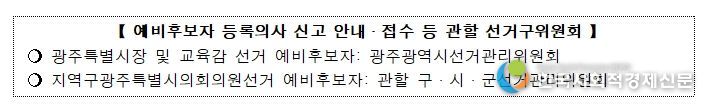 또한, 「공직선거법」 제53조 제1항에 따른 공무원 등은 3월 5일까지 사직해야 공직선거에 입후보가 가능하나, 광주특별시 시장 및 교육감 선거에 입후보하려는 공무원 등은 특별법에 따라 3월 15일까지 사직하면 입후보가 가능하다.