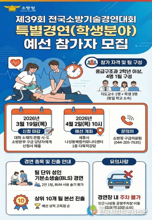 한국사회적경제신문 claire-shin 기자 | 소방청은 미래의 구급대원을 꿈꾸는 대학생들의 응급처치 능력을 향상시키고 예비 응급구조사로서의 자긍심을 고취하기 위해‘제39회 전국소방기술경연대회 특별경연(학생분야)’예선 참가조를 모집한다고 밝혔다.