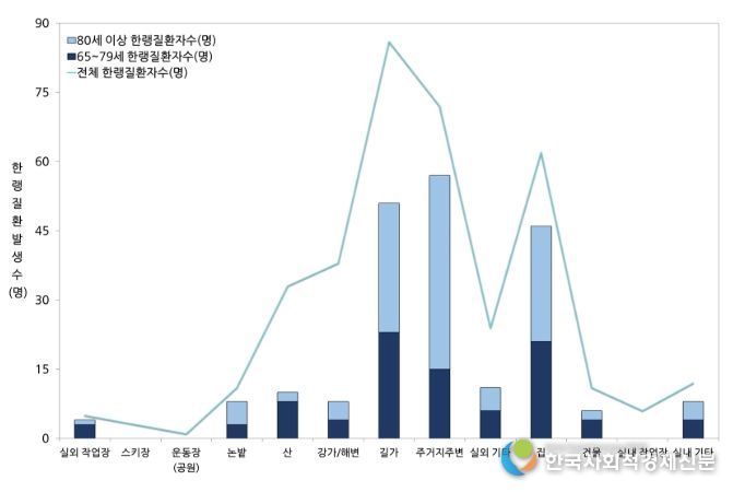발생 연령과 발생 장소의 연관성을 비교해 보면, 가장 많은 한랭질환자 발생 분포를 띄는 65세 이상 연령층(209명)의 주요 증상 발생 장소가 주거지 주변(27.3%, 57명), 길가(24.4%, 51명), 집(22.0%, 46명)으로, 노년층의 일상생활 속 한랭질환 예방이 중요함을 나타내고 있다.