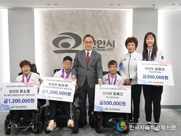 시는 이날 천안시민이자 항저우 장애인아시아경기대회에 출전해 우수한 성적을 거둔 보치아 종목 정소영(단체 1위·개인 2위)·김도현(단체 1위·개인 2위)·최예진(개인 2위) 선수와 태권도 종목 김원선(-65kg 3위) 선수에게 각각 포상금을 전달했다.
