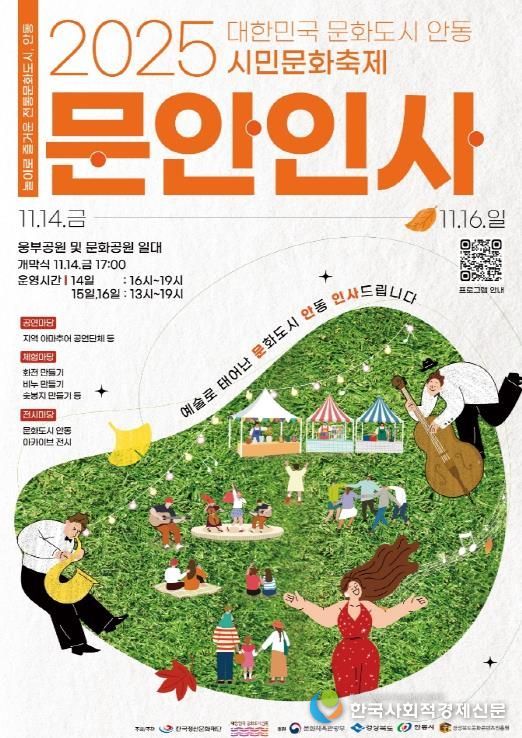 한국사회적경제신문 기자 | 안동시와 한국정신문화재단은 11월 14일부터 16일까지 3일간, 문화공원과 웅부공원 일원에서 ‘2025 대한민국 문화도시 안동 시민문화축제 문안인사’를 개최한다.
