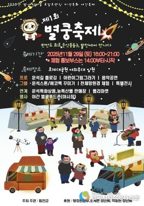 한국사회적경제신문 기자 | 합천군은 11월 29일 토요일 초계대공원 야외무대 일원에서 한반도 최초 운석충돌구를 테마로 한 ‘제1회 별내린마을 별쿵축제’를 개최한다.