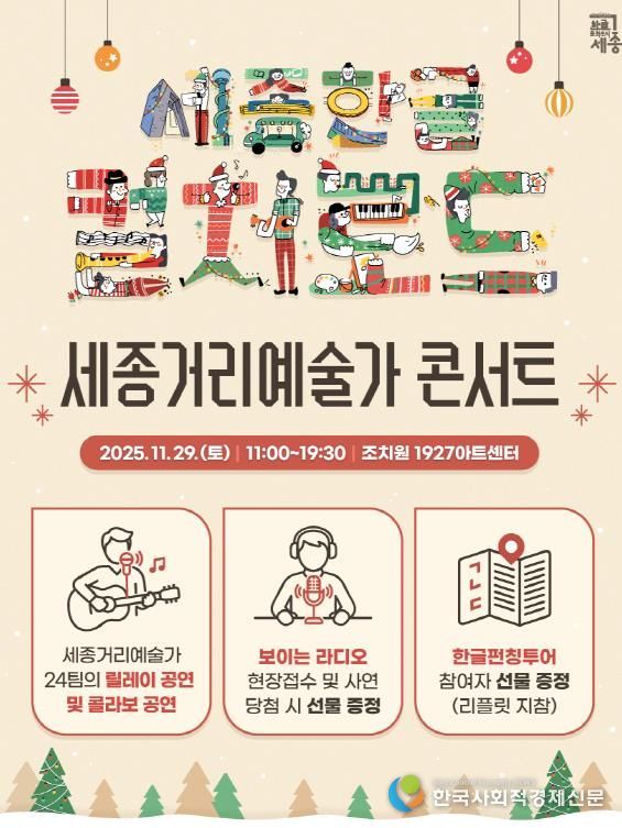 한국사회적경제신문 기자 | 세종시문화관광재단은 오는 11월 29일 오전 11시, 조치원읍 1927아트센터에서 ‘세종거리예술가 콘서트’를 개최한다.