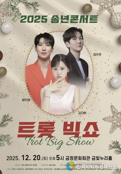 한국사회적경제신문 기자 | 부산시 금정구는 2025년 12월 20일, 금정문화회관 금빛누리홀에서 대한민국 트롯계를 이끄는 가수 양지원, 김다현, 김수찬이 한자리에 모인 특별한 송년 콘서트 ‘트롯 빅쇼’를 선보인다고 26일 밝혔다.