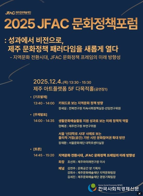 한국사회적경제신문 기자 | 제주문화예술재단(이사장 김석윤)은 '다시 심는 성과, 피어나는 비전'이라는 슬로건으로 '2025년 재단 성과공유주간(이하 성과공유주간)'을 개최한다. 프로그램은 제주아트플랫폼(5층)에서 12월 4일부터 6일까지 3일간 진행된다.