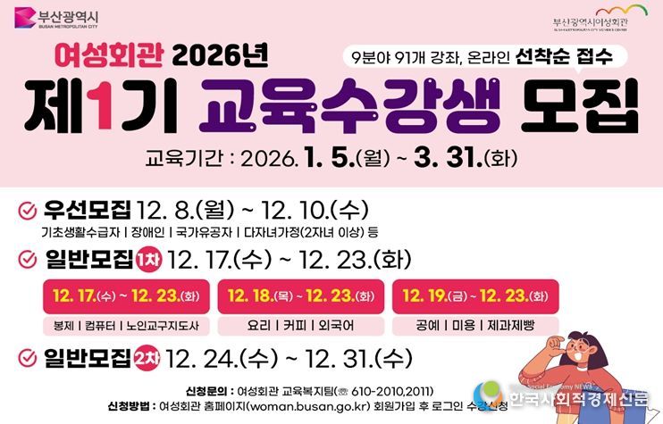 한국사회적경제신문 기자 | 부산시 여성회관은 내일(8일)부터 '2026년 제1기 교육과정' 수강생을 모집한다고 밝혔다.