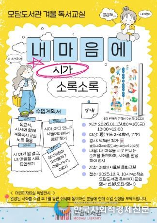 한국사회적경제신문 기자 | 김포시 모담도서관은 12월 방학을 맞아 어린이를 대상으로 1월 13일부터 1월 16일까지 겨울 독서교실 ‘내 마음에 시가 소록소록’을 진행한다.