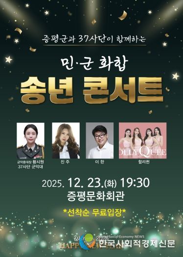 한국사회적경제신문 기자 | 충북 증평군은 오는 12월 23일 오후 7시 30분, 증평문화회관에서 민과 군(軍이) 함께 어우러지는‘민·군화합 송년콘서트’를 개최한다.