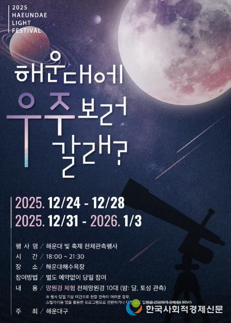 한국사회적경제신문 기자 | 해운대구가 해운대빛축제 특별 이벤트 ‘우주 보러 갈래’를 12월 24~28일, 12월 31일~1월 3일에 운영한다.
