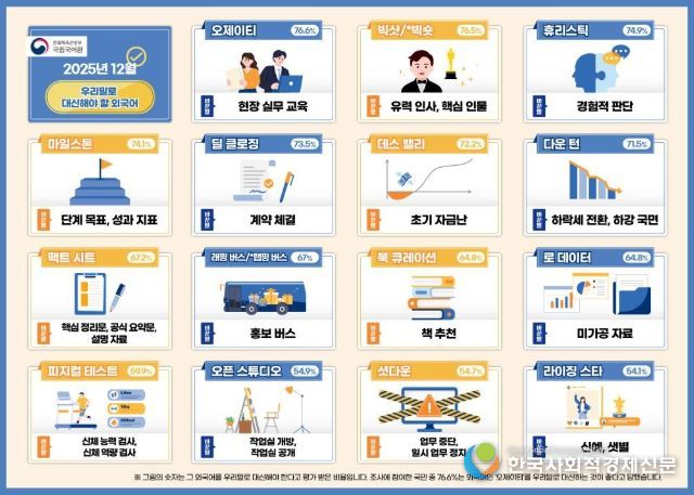 조사 결과 국민이 우리말로 바꾸어 써야 한다고 가장 많이 꼽은 외래 용어는 ‘오제이티’(76.6%)와 ‘빅샷/빅숏’(76.5%), ‘휴리스틱’(74.9%), ‘마일스톤’(74.1%), ‘딜 클로징’(73.5%)이었다. 이에 따라 ‘오제이티’는 ‘현장 실무 교육’으로, ‘빅샷/빅숏’은 ‘유력 인사’ 또는 ‘핵심 인물’로, ‘휴리스틱’은 ‘경험적 판단’으로, 업무 추진 단계에서 기준이 되는 ‘마일스톤’은 ‘단계 목표’ 또는 ‘성과 지표’로, 계약 성사 과정을 뜻하는 ‘딜 클로징’은 ‘계약 체결’로 이해하기 쉽게 다듬었다.