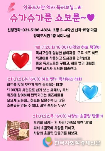 한국사회적경제신문 기자 | 김포시는 2026년 1월 20일 오후 4시부터 6시까지 1층 세미나실에서 초등학교 2~4학년을 대상으로 한 역사 독서교실 '슈가슈가룬 쇼코룬'을 운영한다.