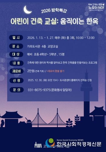한국사회적경제신문 기자 | 고양특례시 가좌도서관은 2026년 1월 13일부터 27일까지 매주 화요일 3회차에 걸쳐 방학특강 프로그램 ‘어린이 건축 교실: 움직이는 한옥’을 운영한다고 밝혔다.