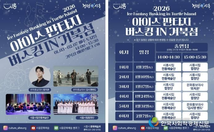 한국사회적경제신문 기자 | 시흥시는 지난 연말에 진행된 ‘2025 시흥 사운드 오브 윈터’의 열기를 잇는 후속 문화예술 프로그램으로, 겨울철 거북섬을 찾는 시민과 관광객에게 풍성한 즐길 거리를 제공하고자 ‘2026 아이스 판타지 버스킹 인 거북섬’을 운영한다.