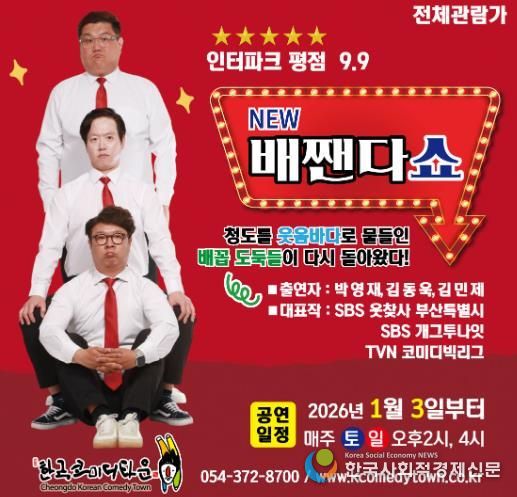 한국사회적경제신문 기자 | 청도군은 한국코미디타운의 브랜드 공연 ‘NEW 배짼다쇼’가 관람객들의 열렬한 성원에 힘입어 더욱 완벽해진 모습으로 돌아왔다고 밝혔다.