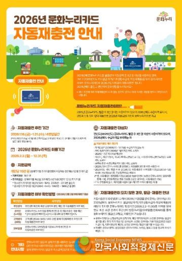 자동재충전 대상은 2025년 문화누리카드를 발급받은 자 중 3만 원 이상의 사용 이력이 있으며, 2026년에도 수급 자격을 유지하는 자로 한정된다. 해당 조건을 충족하면 별도 신청 절차 없이 자동으로 충전되고 1월 중 완료 문자가 발송될 예정이다.