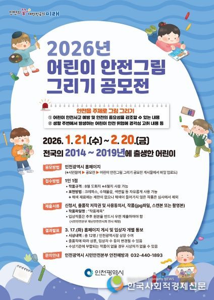 한국사회적경제신문 기자 | 인천광역시는 어린이들의 안전의식을 높이고 생활 속 안전문화 확산을 위해 '2026년 어린이 안전그림 그리기 공모전'을 개최한다고 밝혔다.