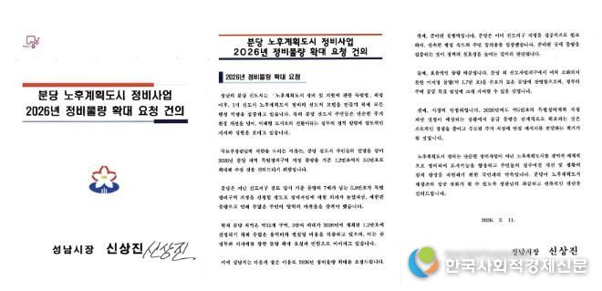 시는 11일 신상진 성남시장 명의로 국토교통부 장관에게 보낸 서한을 통해 “분당 신도시 주민들은 미래형 도시로의 전환이라는 정부 정책 방향에 대해 지지와 참여 의지를 보여주고 있다”며 “이러한 주민들의 높은 정비 의지와 열망을 담아 2026년 특별정비구역 지정 물량의 과감한 확대를 요청한다”고 밝혔다.