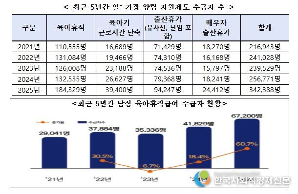 2025년 남성 육아휴직급여 수급자 수는 6만 7,200명으로 전체 수급자의 36.5%를 차지했다. 이는 전년 대비 60.7% 증가한 수치로 여성 증가율(29.1%)을 크게 웃돌았다. 육아휴직, 육아기 근로시간 단축, 출산휴가 등 일·가정 양립 지원제도 수급자 수는 34만 2,388명으로 집계됐다. 관련 통계 작성 이후 처음으로 30만 명을 넘어선 것으로 전년 대비 33.3% 증가해 최근 5년 중 가장 높은 증가율을 기록했다.