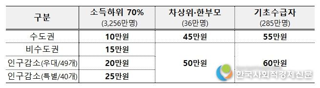 소득 하위 70% 국민에게 거주 지역별로 수도권 10만원, 비수도권 15만원, 인구감소 우대지역 20만원, 인구감소 특별지역 25만원을 지급할 예정이며, 한부모가족・차상위계층은 45만원, 기초생활수급자는 55만원을 지급하되 비수도권에 거주하는 경우에는 1인당 5만원을 추가 지급한다.