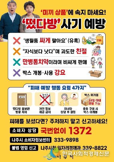 한편 방문판매 및 금융사기 등 소비자 피해 발생 시에는 한국소비자원 소비자상담센터, 나주시소비자정보(고발)센터, 나주시 일자리경제과를 통해 상담 및 신고가 가능하다.